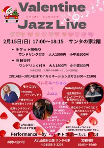 2月15日(日)17:00から大丸山森林公園サンタの家でValentine Jazz Liveを開催します。